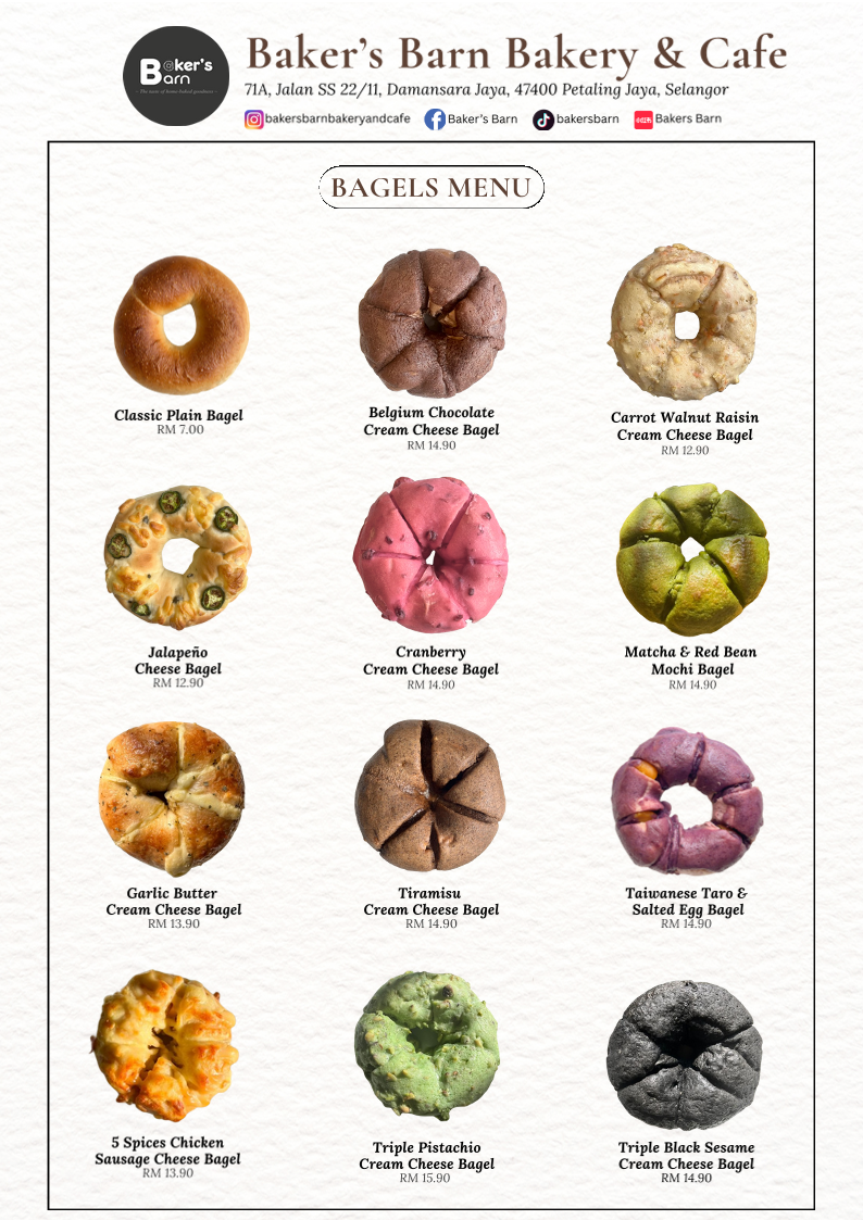 Welcome to Baker's Barn Bakery & Cafe, a delightful haven nestled in Damansara Jaya. This cozy cafe serves a vibrant array of mouthwatering bagels, each crafted with precision and flair. Enjoy classics like the Classic Plain Bagel for MYR 7.00 or indulge in creative options such as the Belgium Chocolate Cream Cheese Bagel for MYR 14.90.